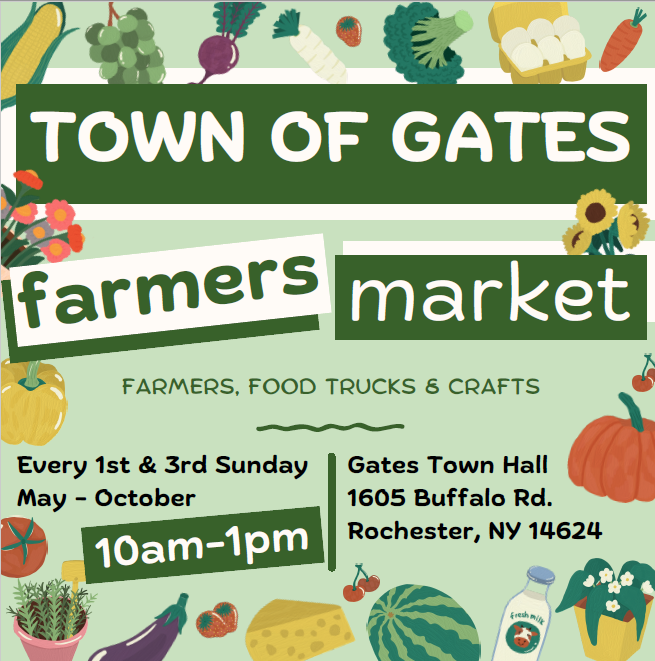 Gates Farmers Market+ Add to Google Calendar+ iCal / Outlook export DateOct 05 2025Expired! Time 10:00 am - 1:00 pm LocationGates Town Hall1605 Buffalo Rd Category CommunityShare this event