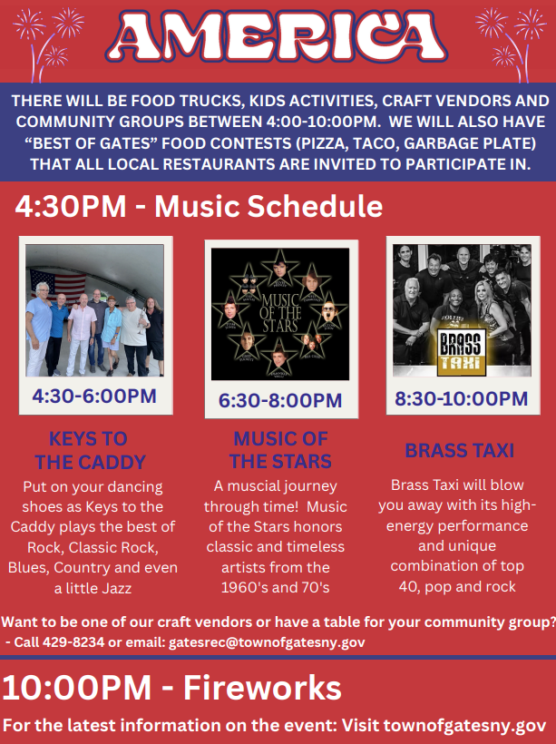 Happy 250th Birthday America Celebration Festival+ Add to Google Calendar+ iCal / Outlook export 00days 00hours 00minutes 00seconds DateJun 27 2026 Time 4:00 pm - 11:00 pm LocationGates Chili High School2 Spartan Way Category CommunityShare this event